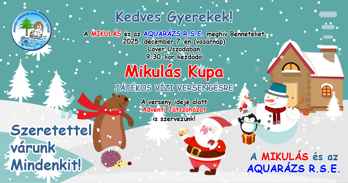 Az idei évben 2025. december 7-én, vasárnap 9.30. órai kezdettel XX. alkalommal rendezzük meg a hagyományos Mikulás Kupa Játékos Vízi Versengést. A versenyen a gyermekek játékos feladatokkal próbálhatják ki, hogy milyen ügyesen mozognak a vízben. A kupán a gyerekek a tudásuknak megfelelő 6-8 fős csoportokban, hasonló korúakkal mérik össze tudásukat.